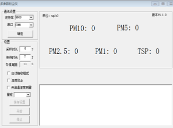 4、应答模式可测量粉尘参数,可以在“设置”区内设置各个测量参数:采样时间、等待时间、量程、是否湿度修正。用户可以自由控制采集时间。